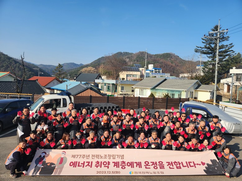[세계타임즈 = 이영진 기자] 한국전력공사(대표이사 사장 김동철)의 전국전력노동조합(위원장 최철호)은 지난 12월 5일 강원도 횡성에서 제77차 노조창립기념일을 맞이하여 겨울철 어려움을 겪는 에너지 취약계층을 위해 연탄 6,000여장 기부하고 연탄나눔 봉사활동을 시행하였다.