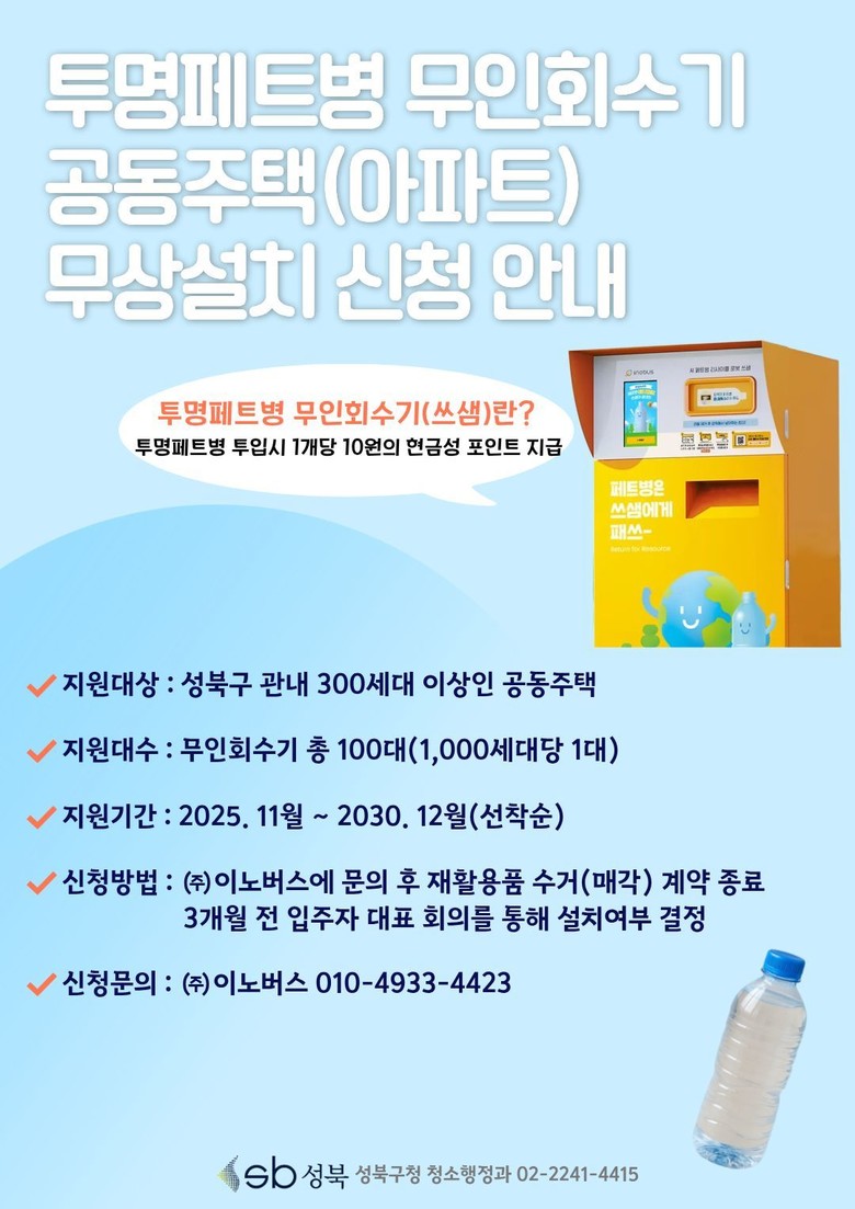 또 지난해 성북구는 11월 무인회수기 운영업체와 협약을 체결하고, 관내 300세대 이상 공동주택을 대상으로 무인회수기 무상 설치 지원 사업을 추진 중이다. 해당 사업은 2030년까지 진행되며, 올바른 분리배출 문화 정착을 위한 홍보와 지원을 이어갈 계획이라고 밝혔다.
