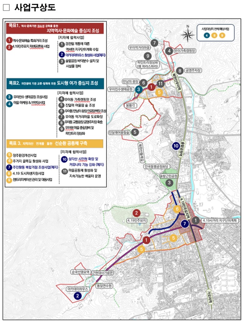 이번 도시재생활성화계획 변경(안)은 2017년부터 추진해 왔던4.19사거리 일대 도시재생사업이 대부분 마무리됨에 따라 사업 추진 과정에서 조정된 사업 규모, 집행예산 등을 계획에 반영하기 위한 절차이다.