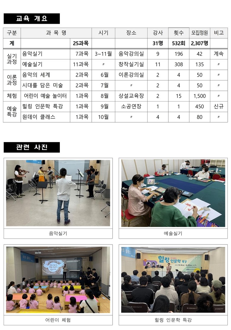 예술 11과목, 음악 7과목 등 총 18개 과목으로 구성돼 전문적인 실기 중심 교육을 제공한다. 시민들은 각 분야별로 기초부터 심화까지 단계적인 교육을 받을 수 있다.