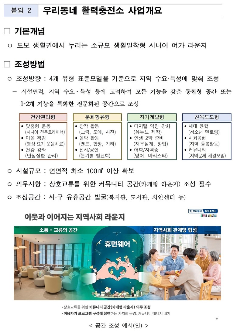 특히 모든 활력충전소에는 커뮤니티 공간을 조성해, 주민들이 자연스럽게 만나고 어울리며 소통·교류할 수 있는 ‘따뜻한 지역사회 거실’로 만든다.