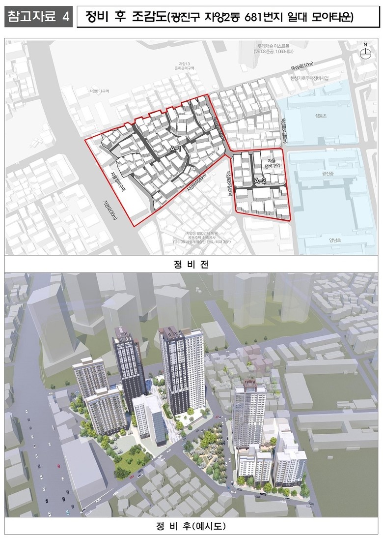 광진구 자양2동 681번지 일대(32,503.3㎡)는 모아타운 사업으로 모아주택 2개소를 통해 총 727세대(임대 166세대 포함)가 공급할 예정이다.