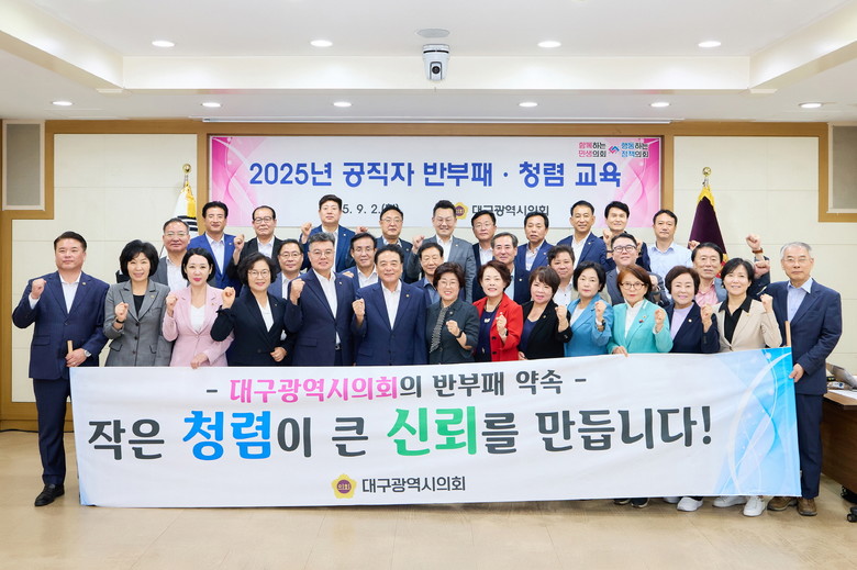 아울러 대구시의회는 그동안 청렴도 향상을 위해 의원 및 직원 대상 맞춤형 청렴 교육 강화, 부패 취약 분야에 대한 자체 점검, 그리고 실효성 있는 부패방지 제도 구축 등 전방위적인 노력을 기울여 왔다. 그 결과 국민권익위원회에서 주관하는 ’2025년도 공공기관 종합청렴도 평가‘에서 광역의회 17개, 기초의회 226개 등 전체 243개 지방의회 평균점수(74.9점) 보다 7.6점을 높게 받아(82.5점), 전년보다 한 단계 상승한 ‘종합청렴도 2등급’을 달성했으며, 이는 전국 광역의회 중 가장 높은 등급에 속한다. 이는 민선 9대 의회가 강조해 온 ‘함께하는 민생의회, 행동하는 정책의회’가 현장에서 실천되고 있음을 보여주는 지표이다.