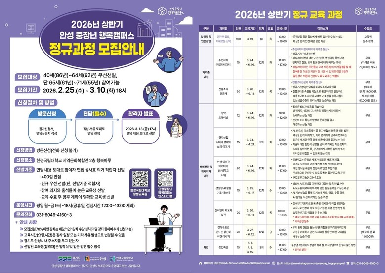 한편 안성 중장년 행복캠퍼스는 안성시 4060 중장년 지원사업 허브기관으로, 종합상담·생애전환 교육·취·창업 지원·동아리 및 사회공헌 활동 연계 등 통합 서비스를 제공하고 있다.