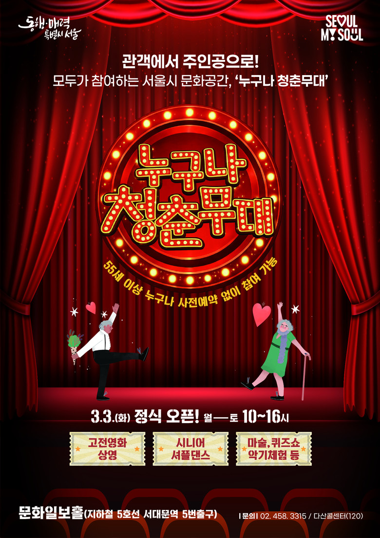‘누구나 청춘무대’(중구 문화일보홀)는 2010년부터 운영된 어르신 전용 극장 ‘청춘극장’을 단순 영화 관람 중심에서 참여·체험 중심의 문화쉼터로 전환한 사업이다. 변화하는 사회 환경과 어르신들의 문화 수요를 반영해 서울시가 올해부터 새롭게 추진하고 있다.