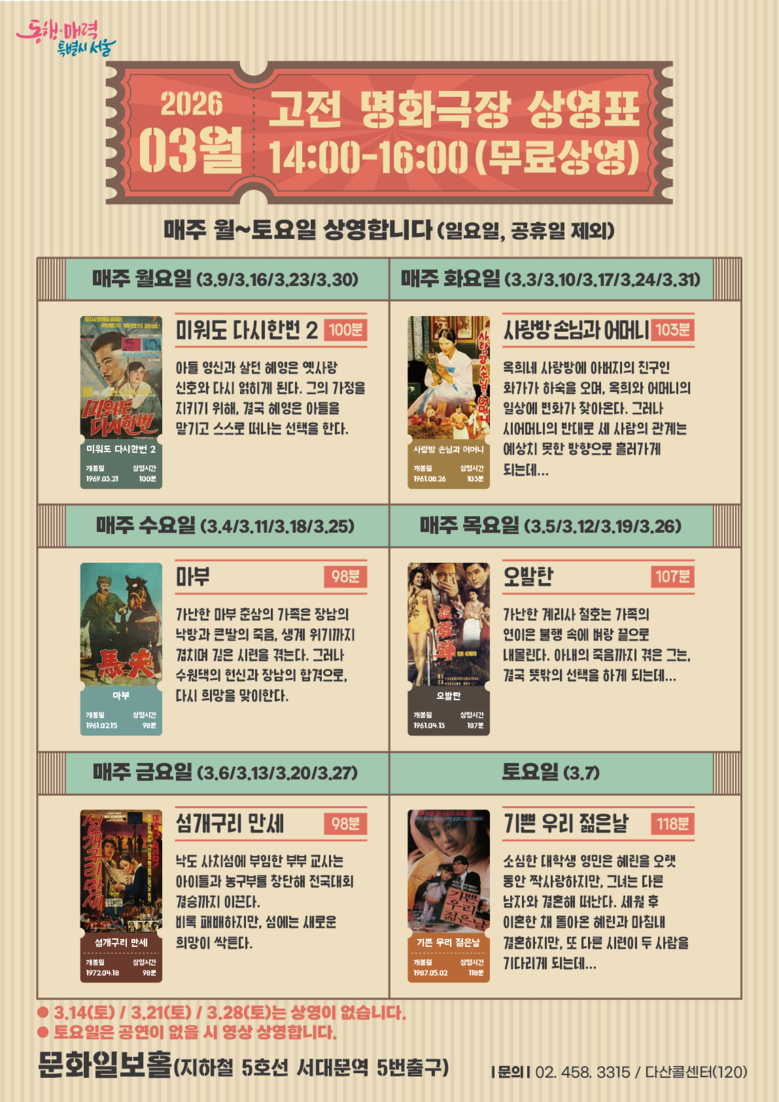 ‘누구나 청춘무대’는 오전(10~12시)에는 신체·정서·사회적 활력을 높이는 참여형 프로그램을 요일별로 운영하고, 오후(14시~)에는 고전 명화 상영뿐 아니라 다큐멘터리, 단편 드라마 등 다양한 영상 콘텐츠와 공연을 선보일 예정이다.