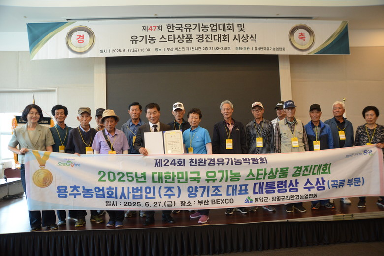 - 경남 함양군 용추농업회사법인(대표 양기조) 용추쌀 대통령상 수상 [세계타임즈=경남 최성룡 기자] 경상남도(도지사 박완수)는 27일 부산 벡스코에 열린 유기농 스타상품 경진대회에서 경남 함양군 소재 용추농업회사법인(양기조 대표)이 생산한 용추쌀이 대통령상을 수상하여 경남 친환경농산물의 우수성을 알렸다고 밝혔다.