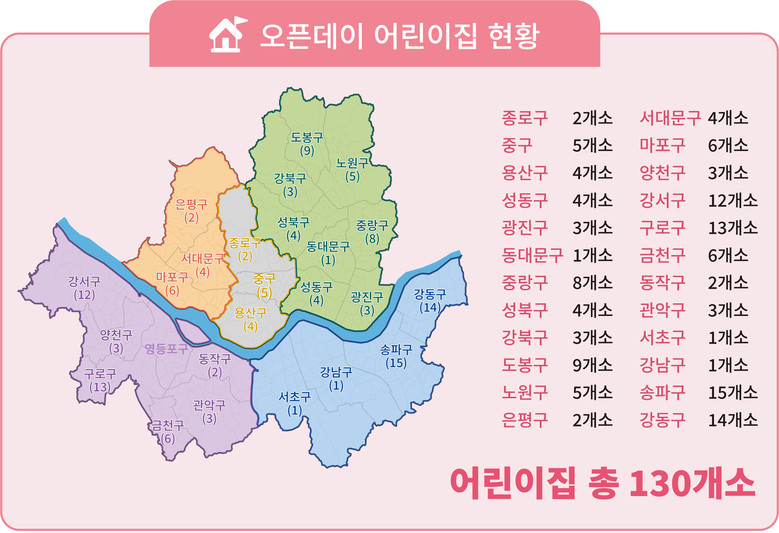 이번 ‘오픈데이’는 130개 어린이집에서 열리며, 참여 어린이집은 ‘서울시 보육포털’ 누리집(https://iseoul.seoul.go.kr)에서 확인할 수 있다.