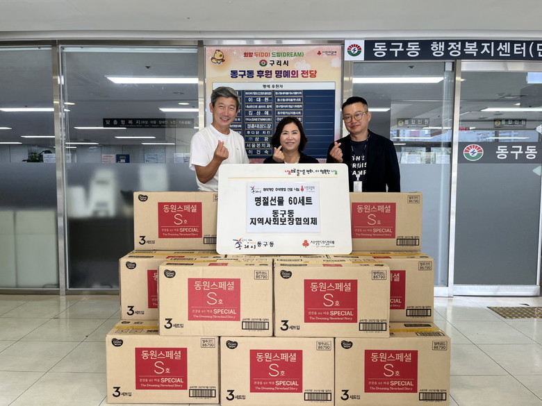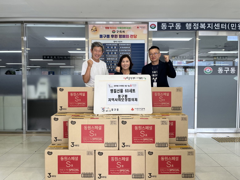 [구리시 세계타임즈=송민수 기자] 구리시(시장 백경현) 동구동 지역사회 보장협의체(민간위원장 김기선)는 지난 9월 25일에 동구동 행정복지센터에서 관내 취약계층을 위해 명절 선물 60세트를 전달하는 나눔 행사를 했다.