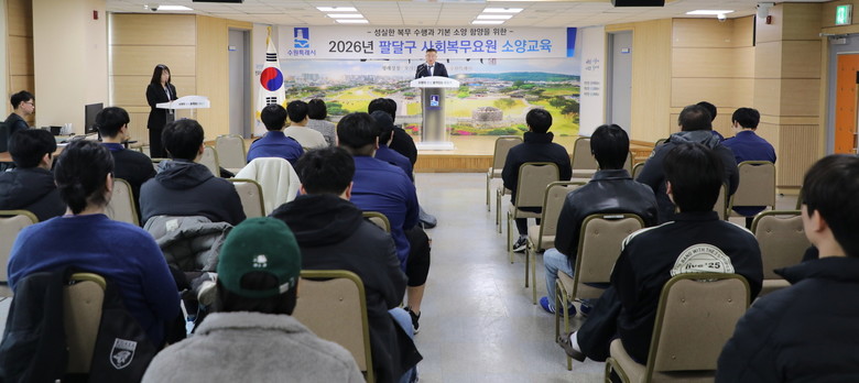 [수원시 세계타임즈=송민수 기자] 수원시 팔달구(구청장 황규돈)는 지난 5일 팔달구청 대회의실에서 사회복무요원 전원을 대상으로 2026년 상반기 소양교육을 실시했다.