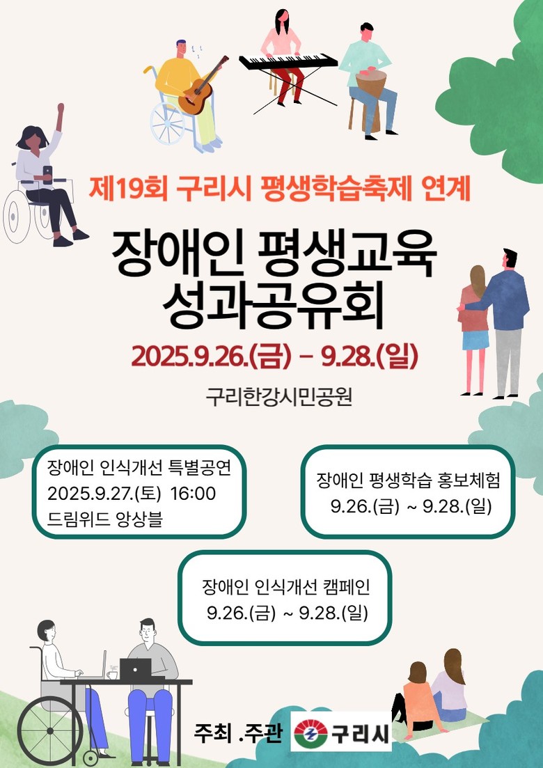 구리시는 장애인의 평생학습 참여기회를 넓히고, 지역 기관과의 네트워크 강화를 통해 장애인의 학습과 사회참여를 지원하고 있다. 올해도 교육부 국립특수교육원이 주관하는 2025년 장애인 평생학습 도시 공모 사업에 3년 연속 선정되어 ▲찾아가는 장애인 평생학습 ▲장애인 평생교육 관계자 역량 강화 교육 등 총 31개 사업에 1억 5,260만 원을 지원하고 있다.