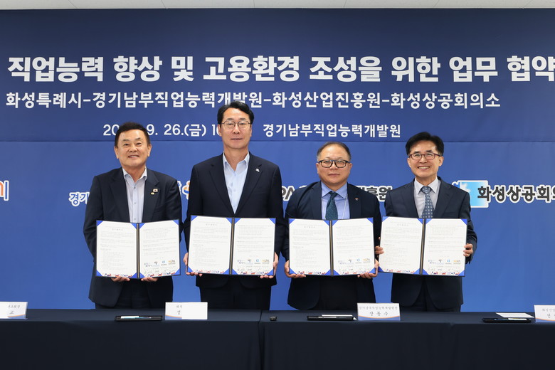 [화성시 세계타임즈=송민수 기자] 화성특례시(시장 정명근)가 26일 경기남부직업능력개발원·화성상공회의소·화성산업진흥원과 ‘장애인의 직업능력 향상 및 장애친화형 고용 환경 조성을 위한 업무협약’을 체결했다.