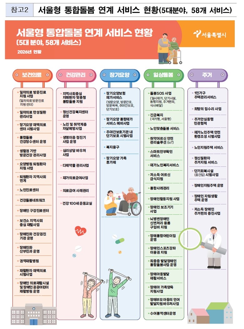 ‘서울형 통합돌봄’은 돌봄 필요 노인(고령 장애인 포함)과 65세 미만 심한 장애인(지체, 뇌병변) 대상 ▴보건의료 ▴건강 ▴장기요양 ▴일상돌봄 ▴주거, 5개 분야 총 58개 서비스를 연계·제공하는 제도로 시는 통합돌봄 비해당 대상자를 예비적 통합돌봄 대상으로 관리하고 6개월마다 모니터링, 필요시 돌봄서비스를 연계할 계획이다.
