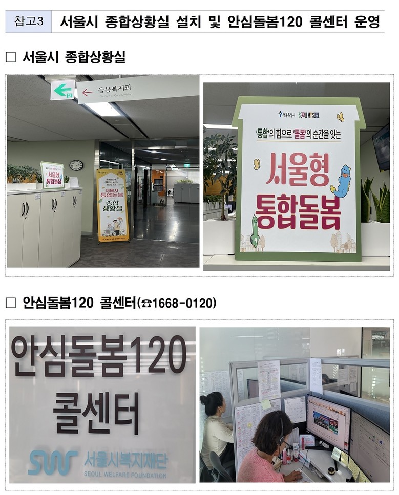 서울시는 어르신, 장애인이 병원이나 시설에 입소하지 않고 살던 곳에서 의료·건강·요양·돌봄·주거 서비스를 통합적으로 맞춤 제공하는 ‘서울형 통합돌봄 서비스’를 본격 시행한다고 밝혔다. 시는 시민 궁금증을 해결해 주고 제도 조기 정착을 돕기 위해 통합돌봄 종합상황실(돌봄복지과) 및 콜센터(☎1668-0120)를 운영한다.