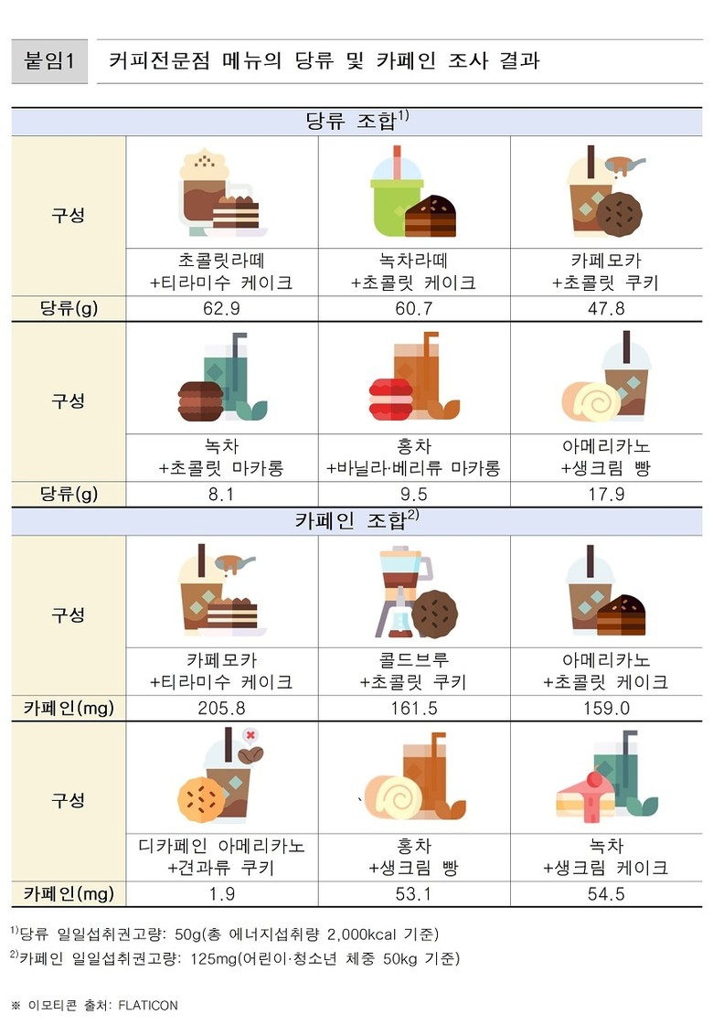 - 고카페인 음료 비율 64%, 일부 음료·디저트 조합 섭취 시 당류·카페인 권고량 초과