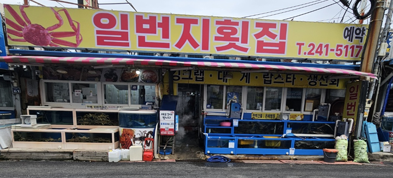 여기에 사계절 따라 봄에는 도다리 가을에는 전어 등 다양한 횟감들이 철 따라 어김없이 나온다. 특히 대개의 하얀속살의 맛 때문에 미식가들이 많이 찾아온다는 "일번지횟집 이곳은 40여 년 명품전통 횟집으로 자리 메김해 가고 있다.
