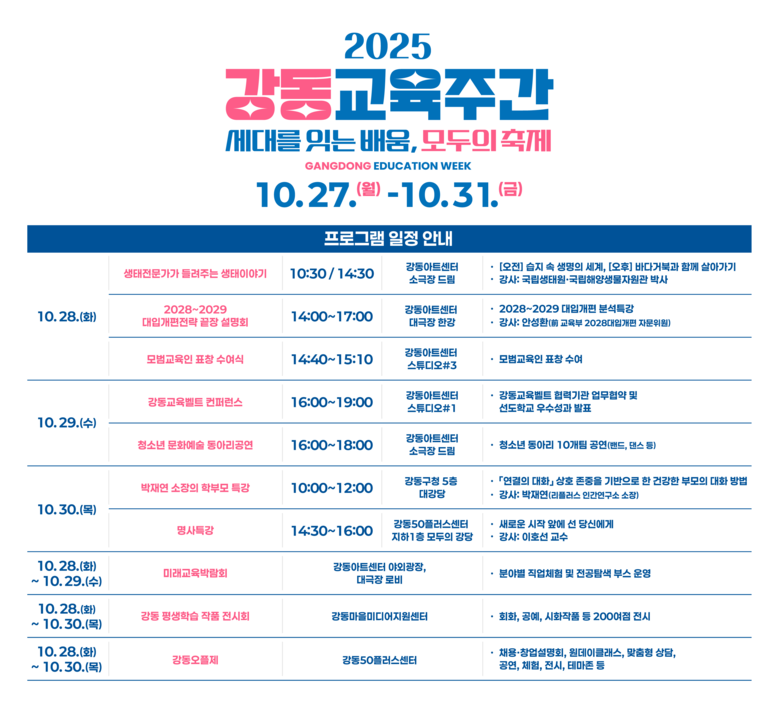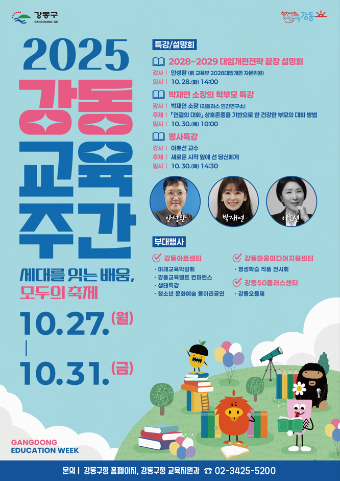 강동교육주간을 맞아 학생·학부모·중장년들을 위한 특강과 설명회가 곳곳에서 운영된다. 10월 28일(화) 강동아트센터에서 ‘2028~2029 대입개편전략 끝장 설명회’가 열려 고교 선택과 진로 설계를 위한 맞춤형 정보를 제공할 예정이다. 이어서 10월 30일(목)에는 자녀와 부모의 건강한 대화 방법을 위한 ‘박재연 소장의 학부모 교육특강’과 상담심리전문가 이호선 교수 특강 ‘새로운 시작 앞에 선 당신에게’가 각각 강동구청과 강동50플러스센터에서 진행될 예정이다.