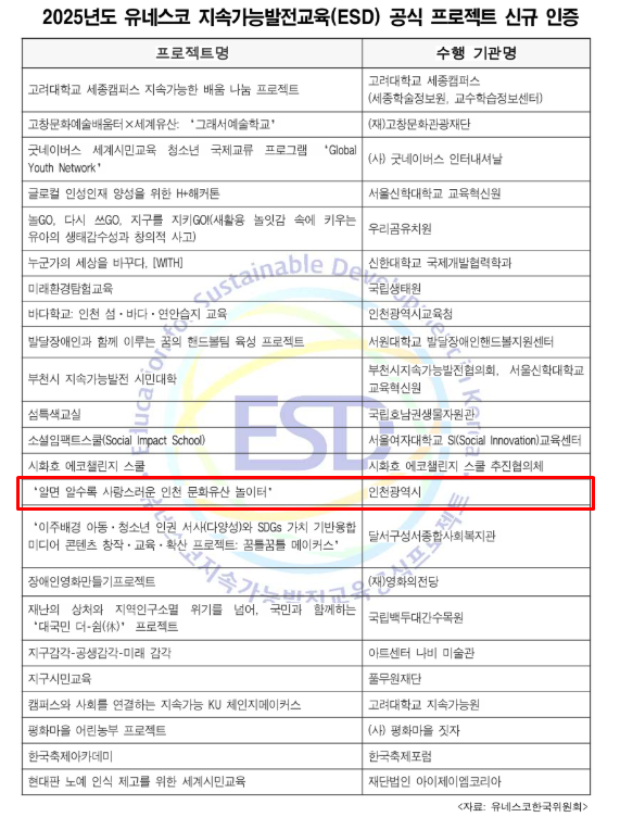 이번 인증 결과 전국에서 총 23개 프로젝트가 공식 인증됐으며, ‘인천 문화유산 놀이터’가 그 중 하나로 선정되며 프로그램의 교육적·사회적 가치를 인정받았다.