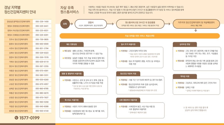 경남도는 지역 내 20개 기초정신건강복지센터, 경찰, 소방, 법무사, 노무사, 특수청소업체, 숙박업소, 장례시설 등 유관기관과 협력체계를 구축하여 신속하고 실효성 있는 지원을 제공할 계획이다.
