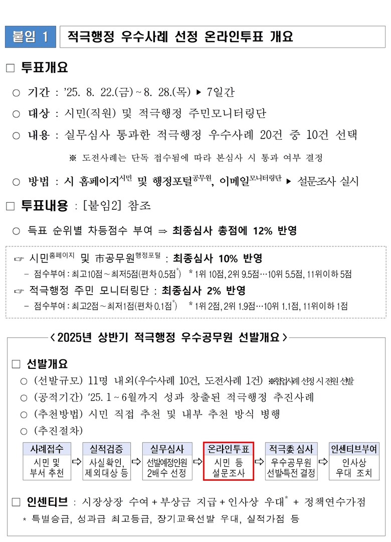 시는 시민이 직접 공감하고 체감하는 적극행정 사례를 선정하고 확산하기 위해 지난 2021년부터 온라인 투표를 시행하고 있으며, 온라인 투표 결과는 '적극행정 우수공무원' 최종심사 총점에 12퍼센트(%)가 반영된다.