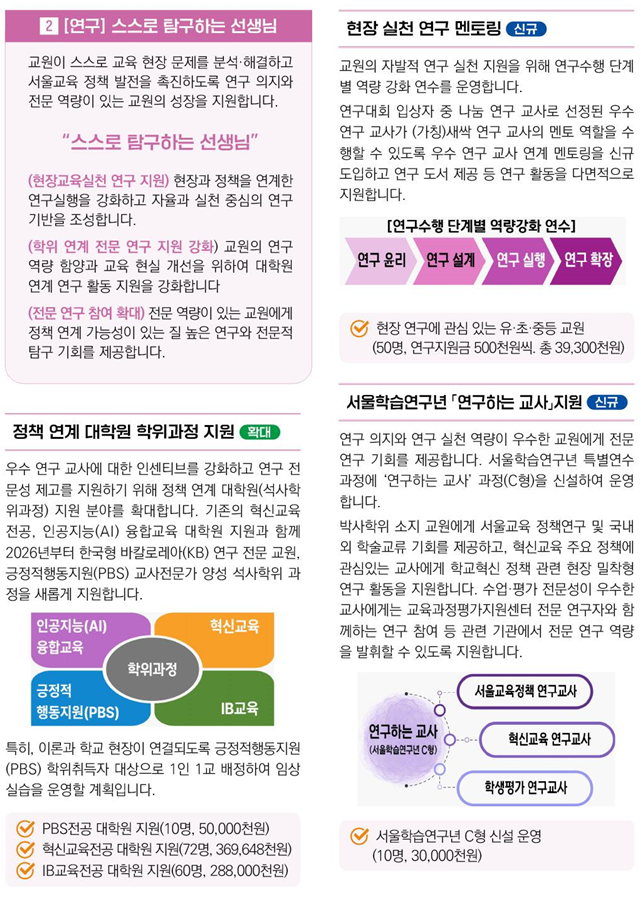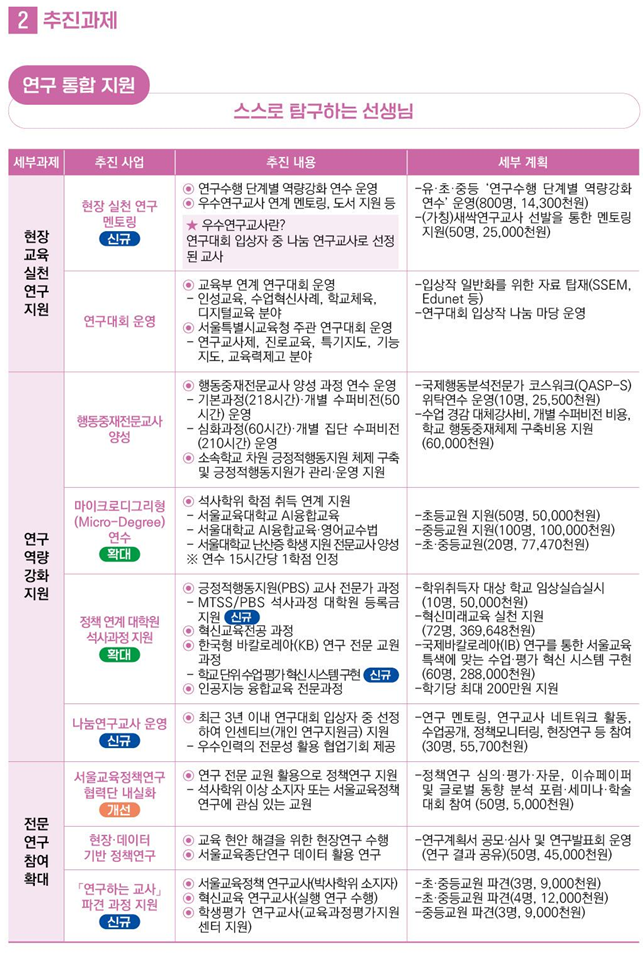 - 교원의 자발적 성장과 연구 실천 지원을 위한 ▲연구 수행 단계별 역량 강화 연수 ▲우수 연구교사 멘토링 운영 등 현장 중심의 자율 실천 연구 기반을 조성한다.