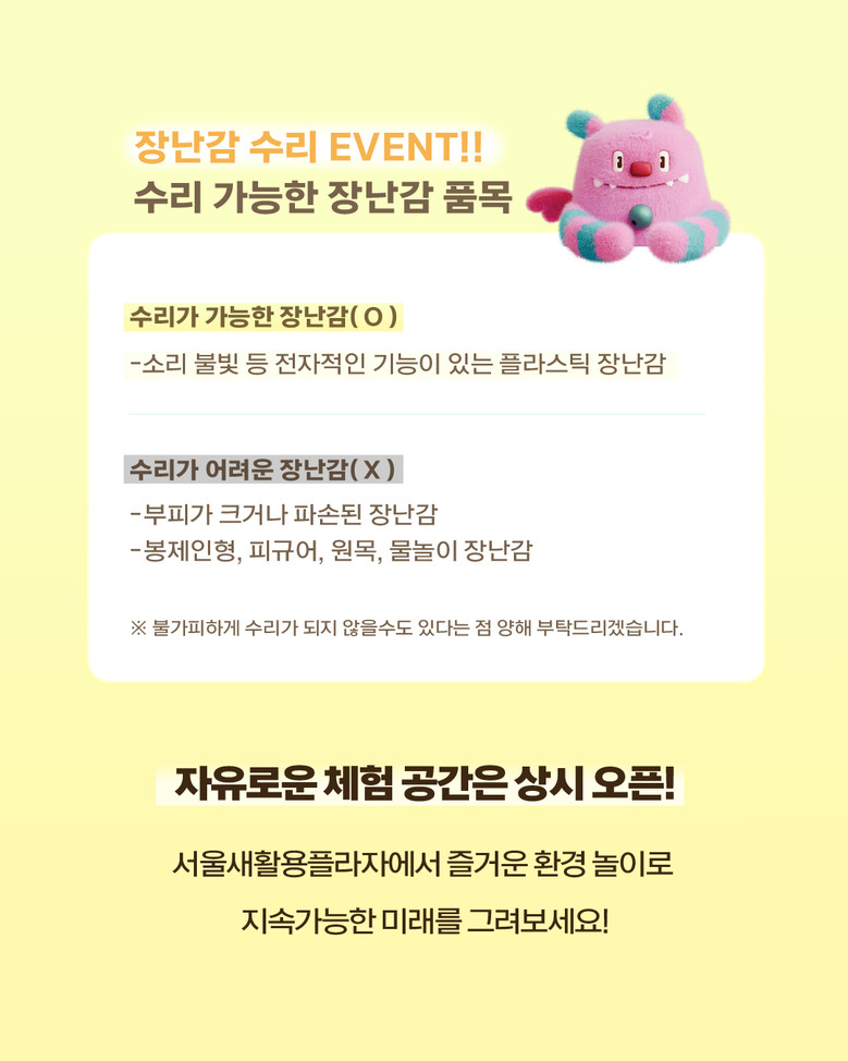 캠페인의 첫 일정은 11월 20일(목) 청계광장에서 진행되는 ‘2025 자원순환 시민행사-초록이의 지구여행(Green's Earth Journey)’ 이다. 시민이 쓰지 않는 장난감을 가져오면 현장에서 재사용 여부를 확인해 새롭게 탄생한 장난감으로 교환해 준다.