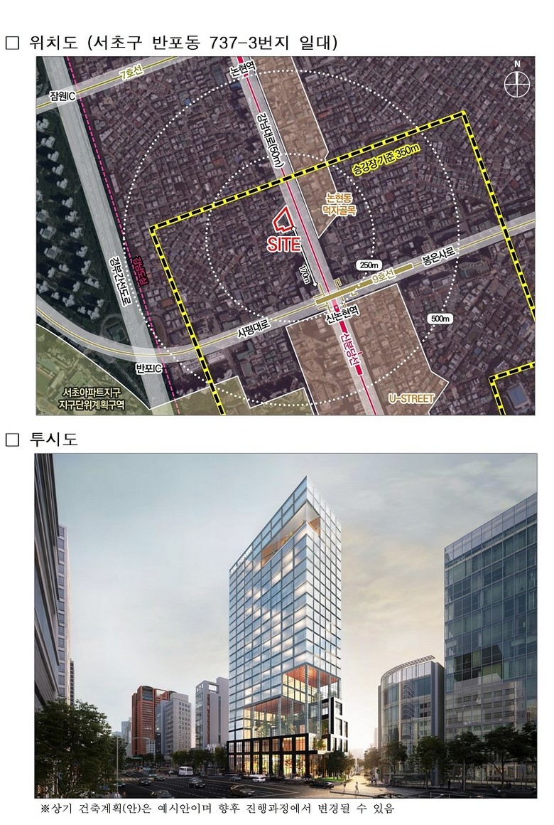 대상지는 9호선과 신분당선이 교차하는 신논현역 인근의 강남대로변에 위치하고 있으며, 업무시설을 포함한 복합문화 상업공간을 조성하는 사업이다. 이를 통해 강남도심의 업무기능이 강화되고 역세권 중심의 가로 활력이 확산될 것으로 예상된다.