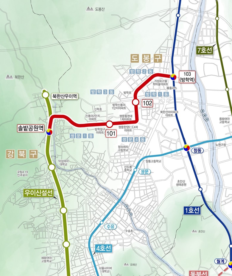 우이신설 연장선은 현재 운영 중인 우이신설선 솔밭공원역과 1호선 방학역을 연결하는 사업으로, 총 연장 3.94㎞ 정거장 3개소(방학역 환승 포함)가 신설된다. 총 사업비 4,690억 원이 투입되며 전체 공사 기간은 공기적정성 심의를 거쳐 79개월로 산정, 오는 2032년 준공을 목표로 진행된다.