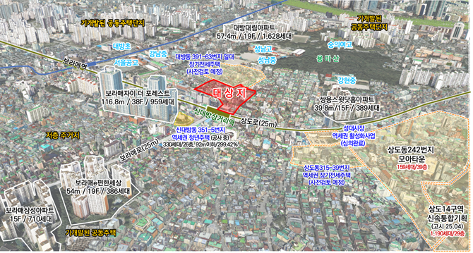 사업 대상지는 지하철 7호선 신대방삼거리역과 상도로에 인접해 가산·대림 및 사당·이수로의 접근성이 우수한 배후 주거지로서, 역세권을 중심으로 생활중심지 육성이 필요한 지역이다.