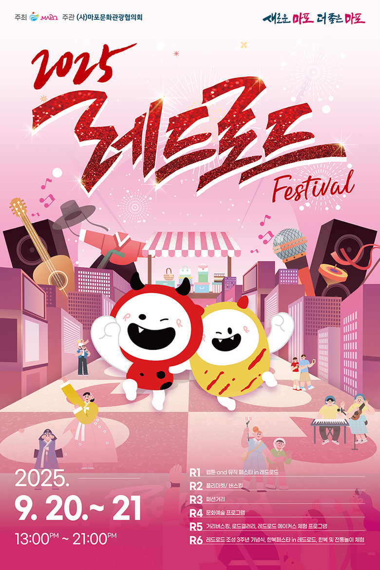 - 축제 기간 레드로드 R1 ~ R6에서 다채로운 공연과 전시, 체험 프로그램 등 [마포구 세계타임즈=이장성 기자] 마포구(구청장 박강수)는 9월 20일과 21일 이틀간 레드로드 일대에서 ‘2025 레드로드 페스티벌’을 개최한다.