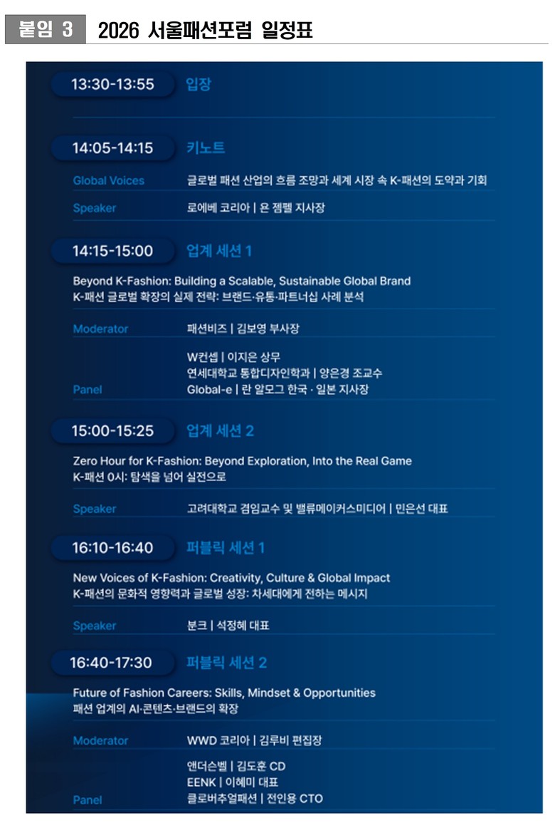 글로벌 연사 로에베(LOEWE) 코리아 욘 젬펠(Jorn Zempel) 지사장이 ‘글로벌 패션 산업의 흐름과 세계 시장 속 K-패션의 도약과 기회’를 주제로 인사이트를 전한다. 업계 세션에서는 이지은 더블유컨셉코리아 상무, 란 알모그(Ran Almog) 글로벌-E 한국·일본 지사장 등이 참여해 K-패션의 글로벌 확장 전략 등 실무적인 관점의 논의를 진행한다.