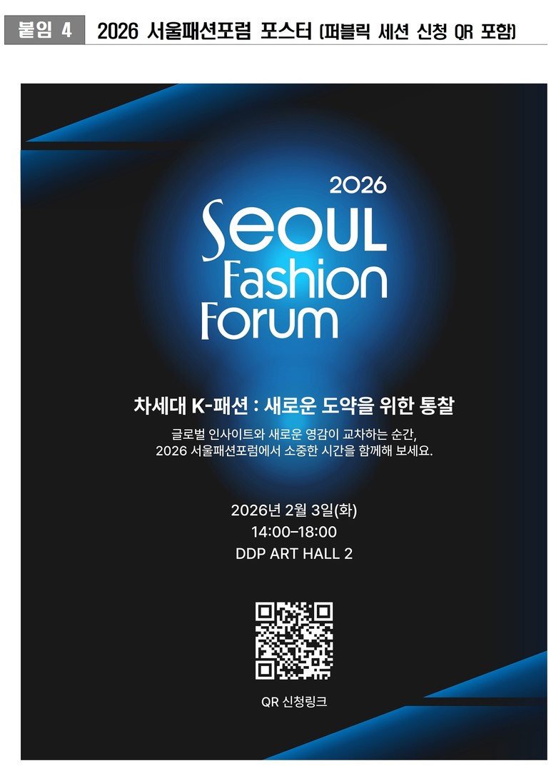 지난해에 이어 두 번째로 마련된 ‘2026 서울패션포럼’은 2월 3일(화) DDP 아트홀 2관에서 개최된다. ‘차세대 K-패션: 새로운 도약을 위한 통찰(The Next Chapter of K-fashion: Deep Dive & Inspiring)’을 주제로 열리는 이번 포럼은 국내외 패션 산업 관계자와 미디어를 중심으로 약 300명이 참여하며, 일부 세션은 퍼블릭 세션으로 구성해 산업 담론을 시민과 공유한다.