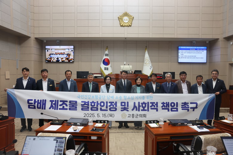 고흥군의회는 △담배 제조사의 ‘표시상의 결함’ 및 ‘제조물의 결함’ 인정 △국민건강보험공단의 건강보험 진료비에 대한 담배 제조사의 손해배상 책임 이행 △중앙정부와 관계기관의 담배규제기본협약 등에 근거한 금연 환경 조성 정책 마련 등을 촉구했다.