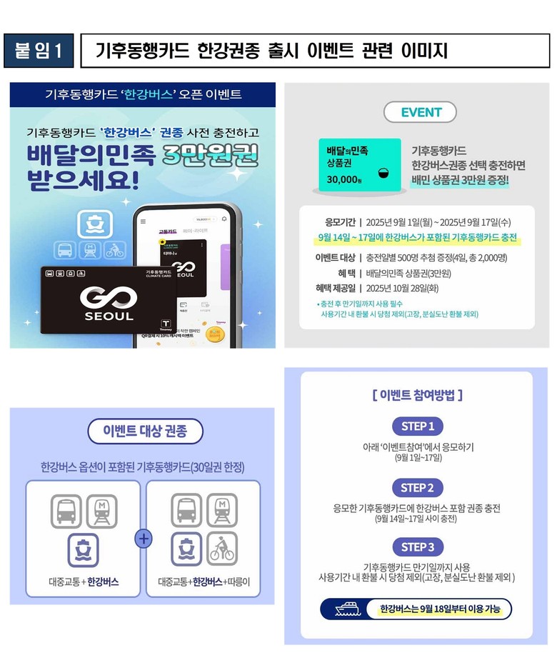 서울시는 오는 9월 14일(일)부터 기후동행카드 맞춤형 할인 확대와 함께 한강버스 신규 권종을 출시한다고 밝혔다. 18일(목) 한강버스 정식 출항을 앞두고 있는 만큼 이용을 원하는 시민이 사전에 편의를 누릴 수 있도록 다각화된 서비스를 동시에 선보인다.