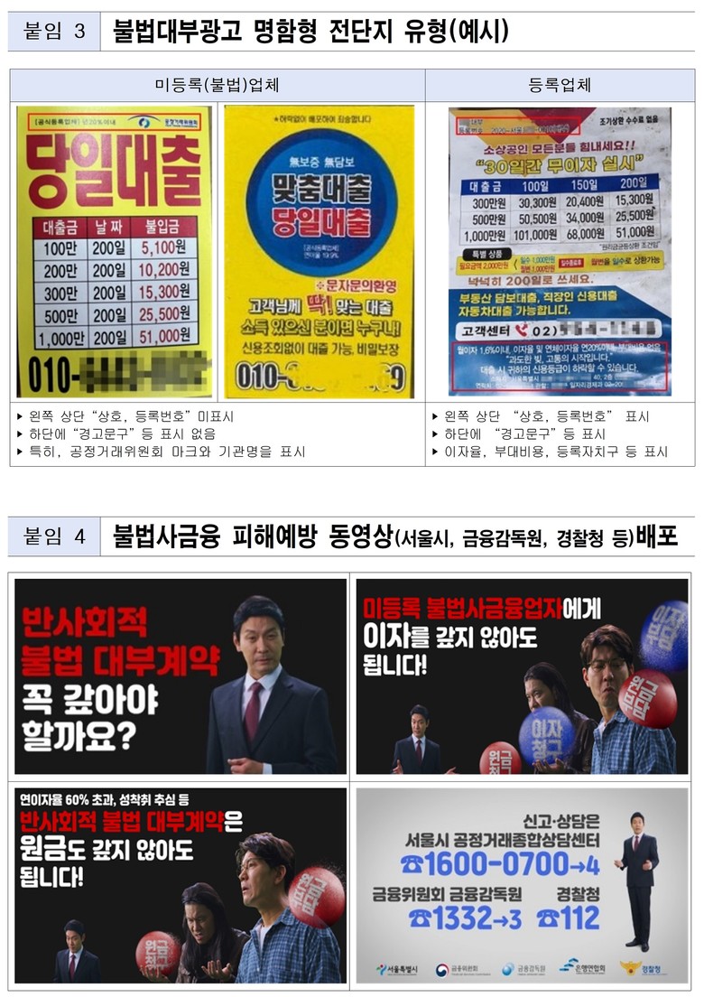 서울시는 청년층이 자주 이용하는 포털사이트, SNS, 구직 커뮤니티 등을 대상으로 불법대부광고 집중 모니터링에 나선다. 불법대부 광고에 사용된 전화번호는 ‘대포킬러시스템’*을 통해 즉시 차단한다.