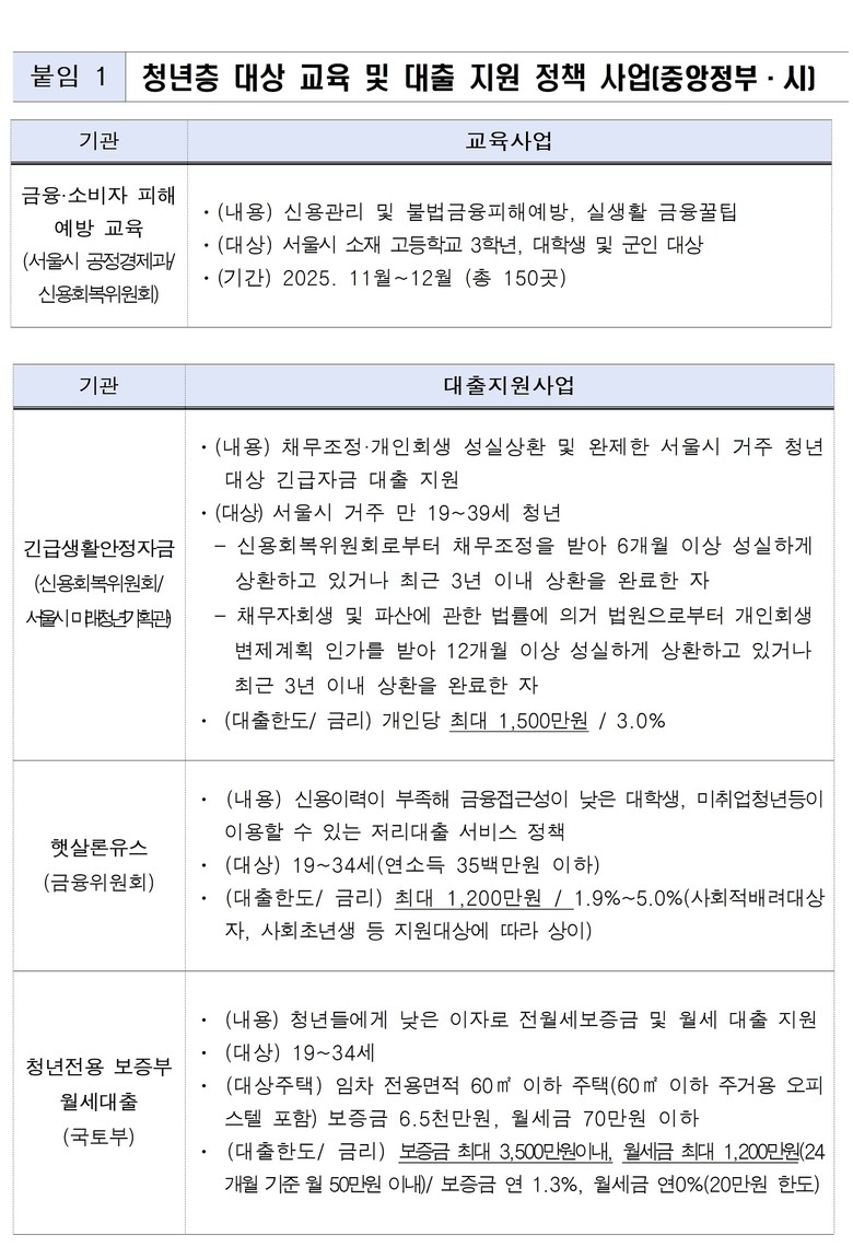 청년이 스스로 금융 위험에 대응할 수 있도록 ‘금융역량 강화 교육’도 병행한다. 교육은 ‘생활형 금융 안전’을 주제로 신용·재무관리, 불법사금융 및 보이스피싱 대응법, 전세사기 유형, 청년 전용 대출 비교, 파산·회생 제도 등 실질적인 금융 지식을 다룬다.