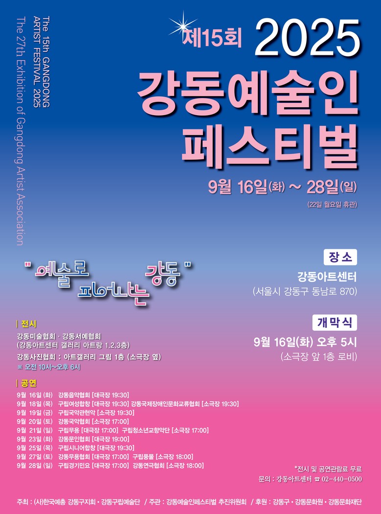 이수희 강동구청장은 “올해로 15회를 맞은 강동예술인 페스티벌은 강동이 가진 문화적 저력을 보여주는 대표적인 행사”라며 “앞으로도 지역 예술인의 창작 활동을 꾸준히 지원하고, 강동예술인 페스티벌을 주민과 함께하는 열린 축제로 더욱 발전시켜 나가겠다”고 말했다.