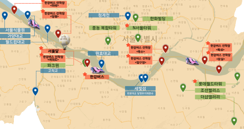 - 한강, DDP, 도심 등 주요 장소에서 다양한 축제·이벤트 개최, 관광코스 운영