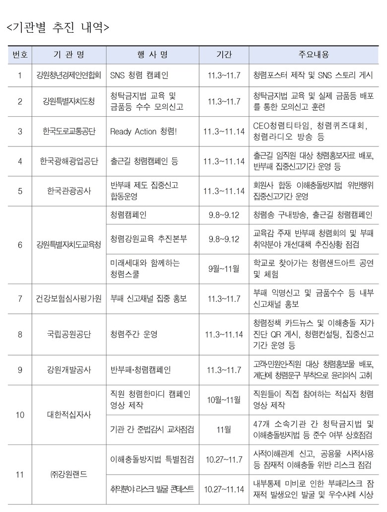이 외에도 한국관광공사는 「이해충돌방지법」 합동 집중신고 운영을, 민간부문 회원사인 강원청년경제인연합회는 청렴포스터 제작 및 에스엔에스(SNS) 스토리 게시를 하는 등 여러 회원사가 청렴주간에 적극 동참했다.