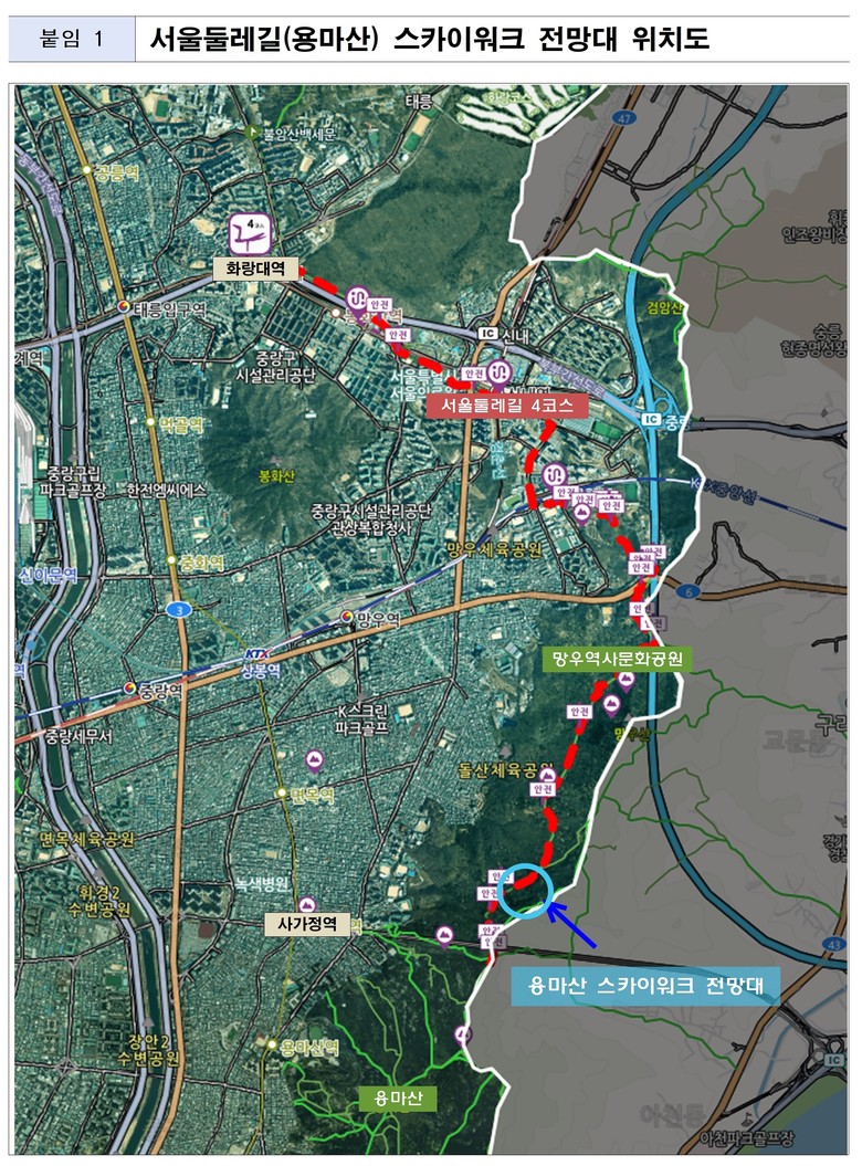 이번 용마산 스카이워크 전망대는 ‘서울둘레길 2.0’ 추진에 따라 새로운 공간 경험을 더하는 첫 사례로 조성됐다. 용마산은 중랑구에서 가장 높은 산(해발 348m)으로 정비가 잘 되어 있어 편안한 트레킹이 가능하고, 도심 전망이 뛰어난 구간이다.