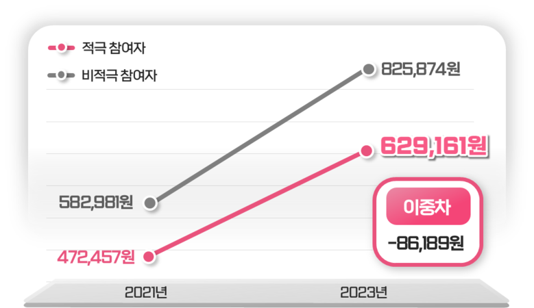 적극참여자의 외래비는 ’21년 47만2457원에서 ’23년 62만9161원으로 15만6704원 늘었고, 비적극 참여자 외래비는 58만2981원에서 82만5874원으로 24만2893원 증가했다. 적극참여자의 증가폭이 8만6189원 적은셈이다. 입원비 증가폭도 적극 참여자가 18만1,404원 적었다.