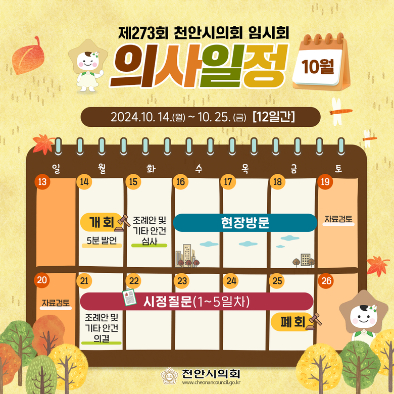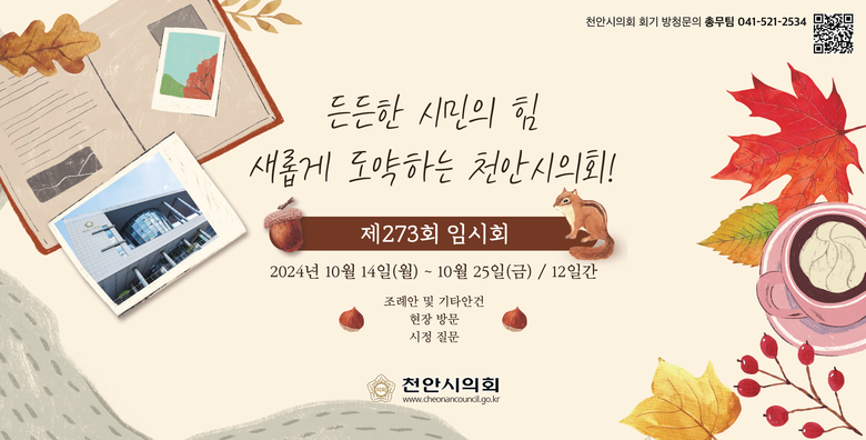 [천안시 세계타임즈=백택기 기자] 천안시의회(의장 김행금)가 10월 14일부터 10월 25일까지 12일간 제273회 임시회를 운영한다.