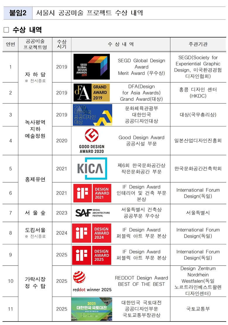최인규 서울시 디자인정책관은 “이번 3관왕 수상은 지난 15년간 일관되게 추진해 온 공공미술 정책의 결실이자 시민·예술가·행정이 함께 이룬 성과”라며, “앞으로도 서울시는 시민의 일상 공간, 공원, 광장, 수변 등 시민 가까이에 예술과 자연, 시민이 하나 되는 공공미술을 확대해 삶의 질을 높이고 선도적인 문화도시로서의 위상을 강화해 나가겠다”라고 말했다.