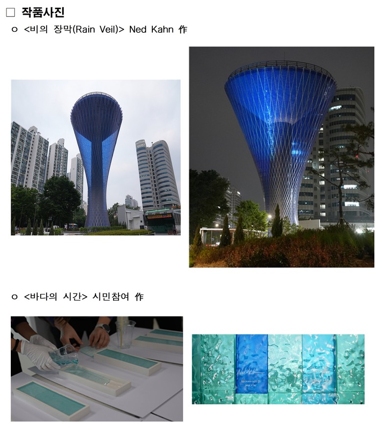 가락시장 정수탑은 1986년 건립 후 2004년 기능을 상실해 20여 년간 방치되던 시설이었다. 시는 이곳에 공공미술의 방식을 적용해 세계적인 환경예술가 네드 칸(Ned Kahn)의 <비의 장막(Rain Veil)>과 100명의 시민이 함께 만든 <바다의 시간> 작품으로 새롭게 탄생시켰다. 주변 녹지 약 7,000㎡는 송파구와 서울시농수산식품공사의 협력으로 가로정원이 조성돼 예술과 휴식이 있는 쉼터가 됐다.