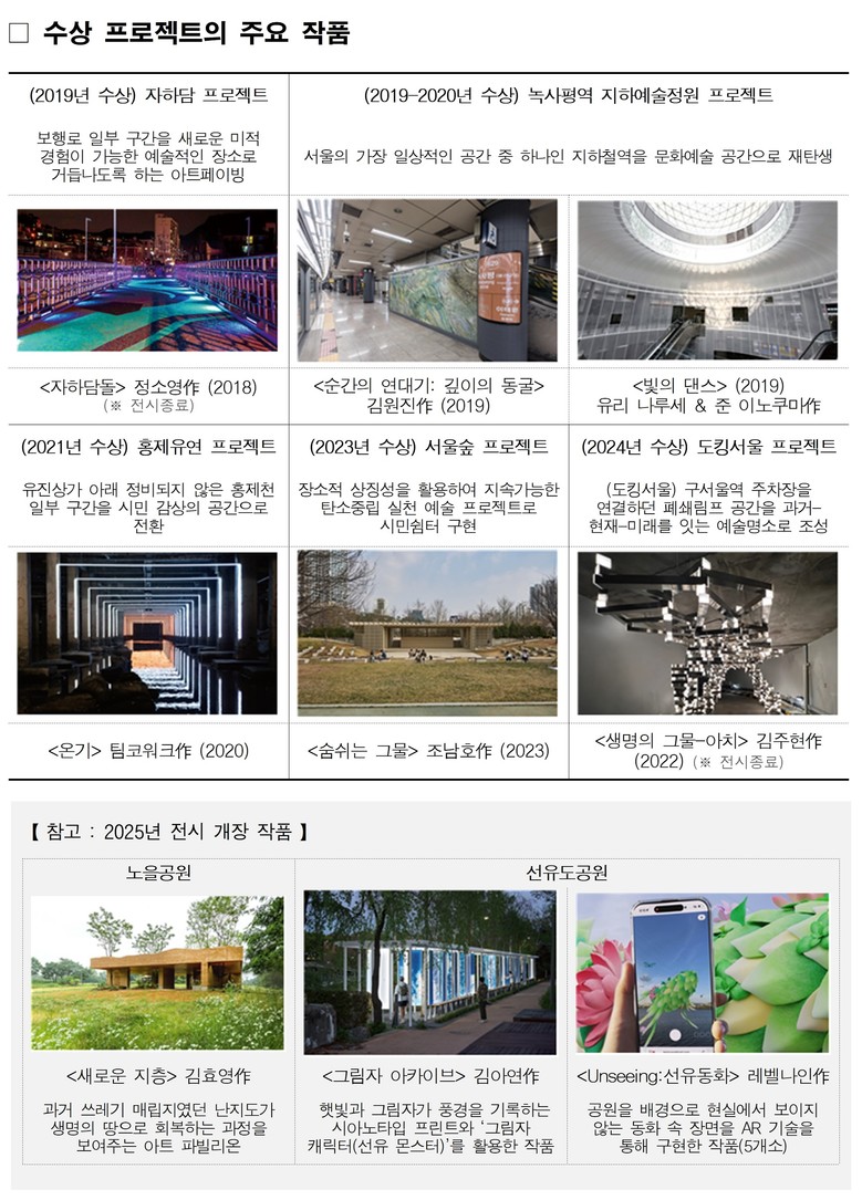 한편 서울시는 2025년 공공미술 프로젝트로 노을공원에서 <새로운 지층>, 선유도공원에서 <그림자 아카이브>와 <선유동화>를 시민들에게 선보이고 있다.