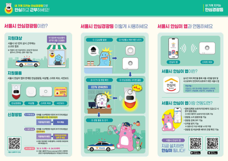 또한, 서울시 ‘안심이앱’에 미리 지정한 보호자(최대 5명)에게 긴급상황 알림 문자가 발송되는 등 다양한 방법으로 1인점포의 안전을 보호한다.