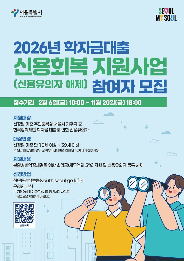 한국장학재단 학자금 대출로 인해 신용유의자로 등록된 서울 거주 19~39세 청년은 2월 6일(금) 오전 10시~11월 20일(금) 오후 6시 청년 몽땅 정보통 누리집에서 신청하면 된다. 단, 이미 서울시 또는 타 기관에서 유사 사업 지원을 받은 경우 지원 대상에서 제외된다.