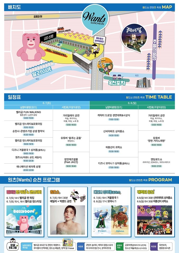 한편 ‘원츠 순천’은 ▲에일리 축하공연 ▲루미뚱이 팝업매장 ▲애니메이션 퇴마록 상영 ▲벨리곰 포토존 등 다양한 콘텐츠로 꾸려진다.