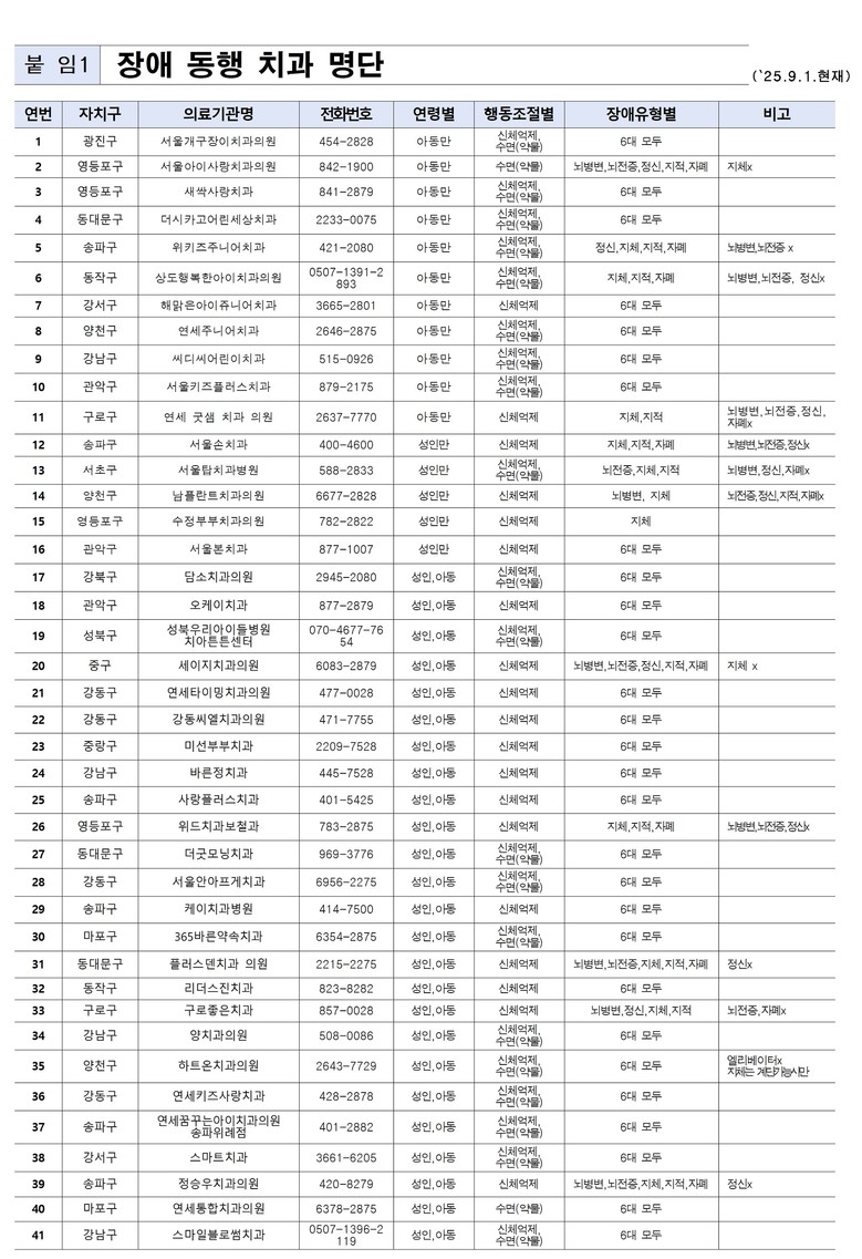 ‘장애 동행 치과’ 명단과 자세한 정보는 서울시 누리집(www.seoul.go.kr)과 서울시 치과의사회 누리집(www.sda.or.kr)에서 확인할 수 있으며, 120 다산콜센터에서도 안내받을 수 있다.