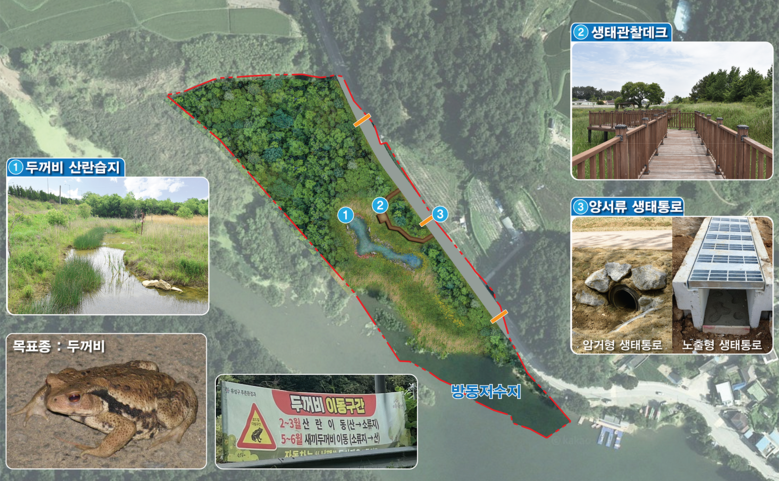 특히, 대전 유성구에 위치한 방동저수지는 두꺼비 산란지로 부화한 새끼 두꺼비가 인근 산장산으로 이동할 때 로드킬 등 피해가 빈번하게 발생하였지만, 저수지 인근에 생태통로, 유도 울타리 등의 설치로 야생생물의 생명을 보호하고 교통사고 위험을 방지하여 주민들의 불편을 해소할 예정이다.